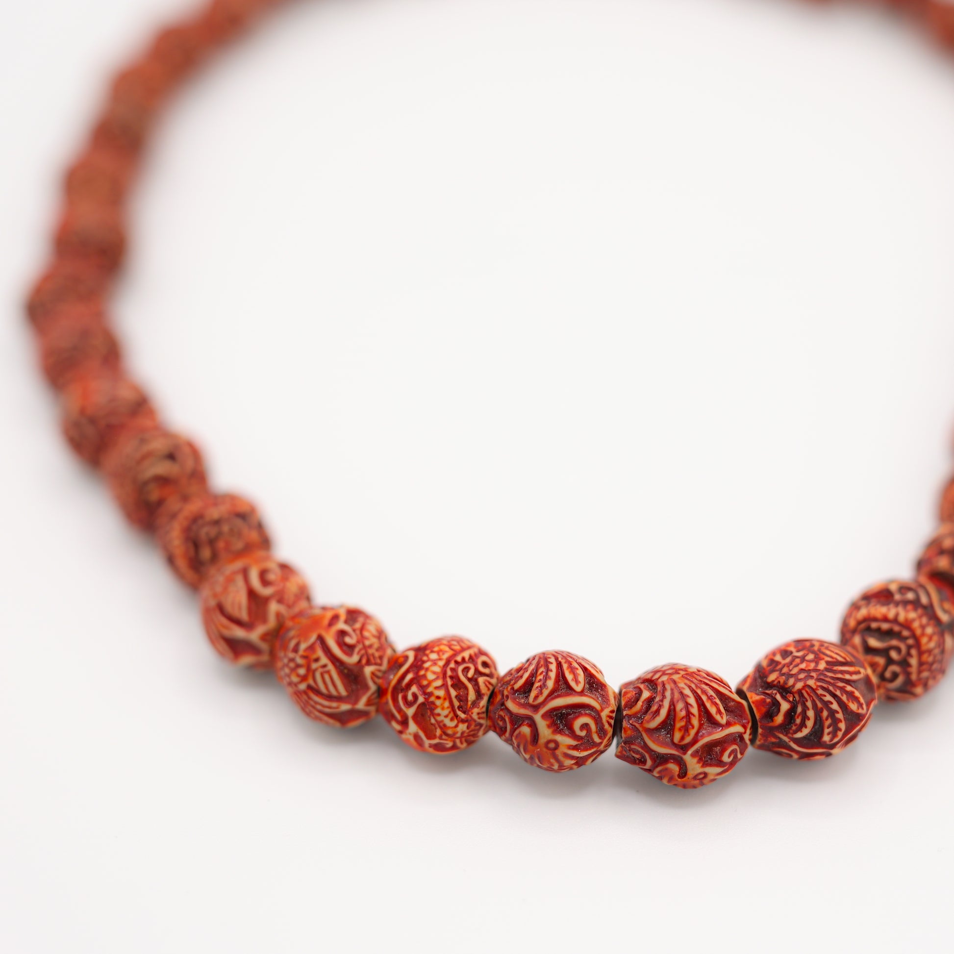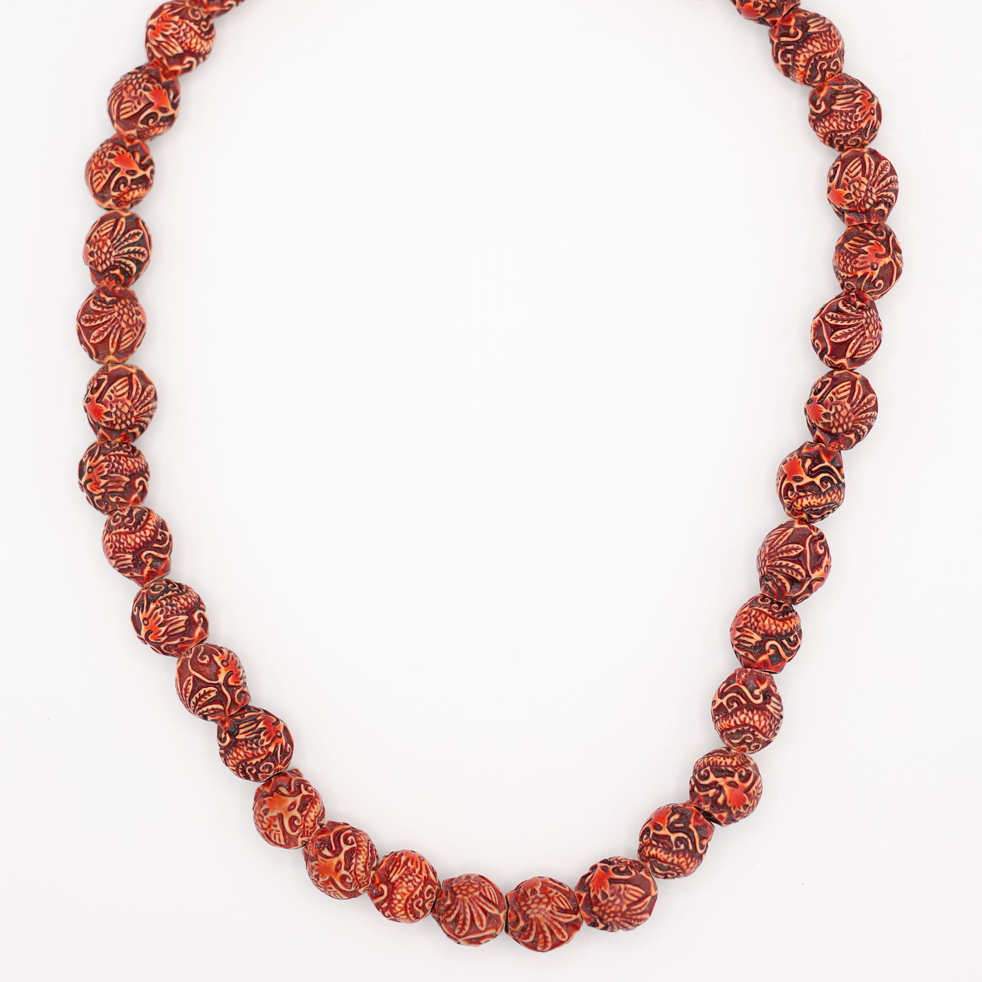 Introducing our exquisite handmade necklace, the Jungle Beads. This captivating piece features red carved stone beads that resemble molten lava, making it a true conversation starter. With its perfect blend of boldness and elegance, this necklace effortlessly adds a touch of intrigue to any outfit.