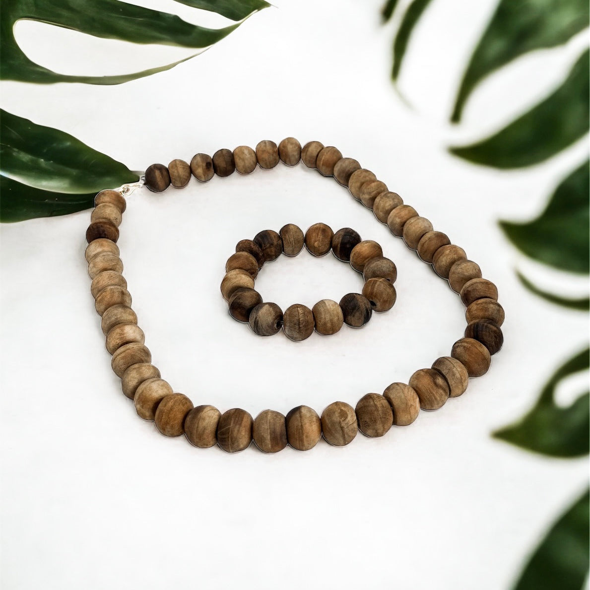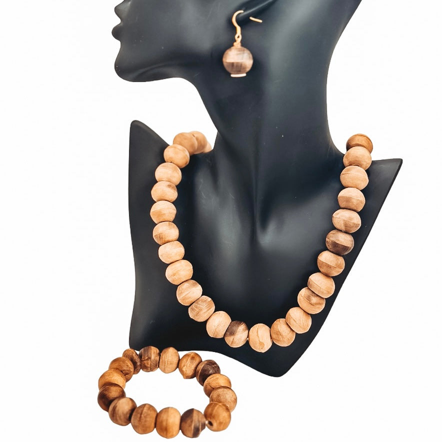 The Rustic Harmony Set is a captivating jewelry ensemble handcrafted from natural wood. Embrace the raw, organic charm of each uniquely designed necklace, bracelet, and earrings. With rich earthy tones and intricate wooden beads, this set effortlessly blends nature's beauty with elegant craftsmanship.